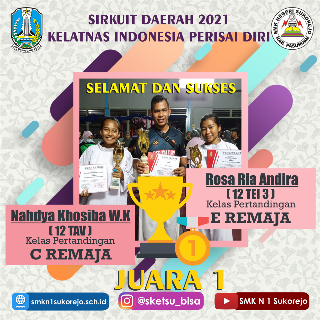 Selamat dan sukses atas nama Nahdya Khosiba W. K dari kelas XII TAV yang mendapatkan Juara 1 di kelas pertandingan C Remaja dan Rosa Ria Andira dari kelas XII TEI 3 yang mendapatkan Juara 1 di kelas pertandingan E Remaja.