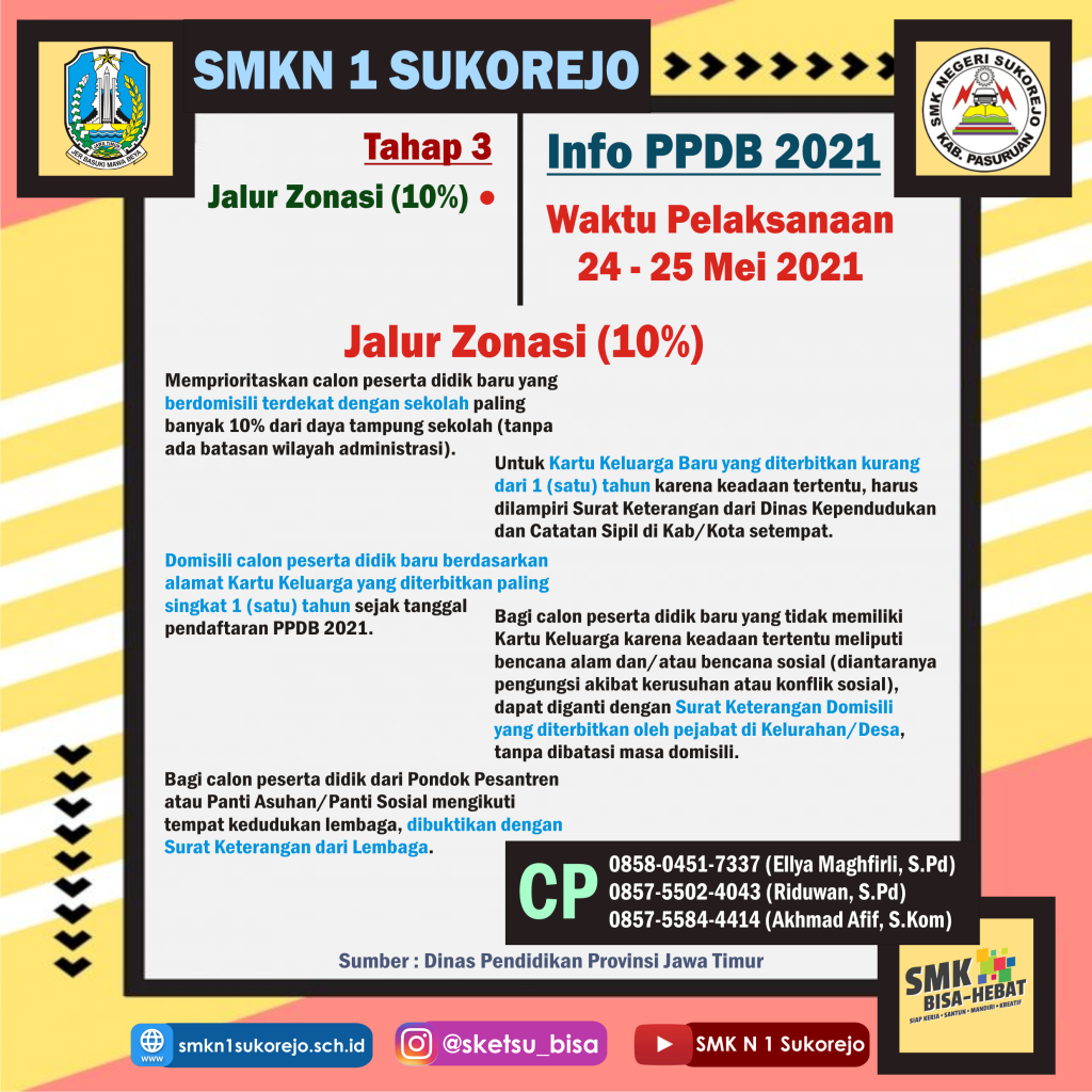PPDB SMKN 1 Sukorejo mengacu pada Juknis yang diedarkan oleh Kepala Dinas Pendidikan Provinsi Jawa Timur dimana dibagi menjadi 3 tahap, diantaranya: