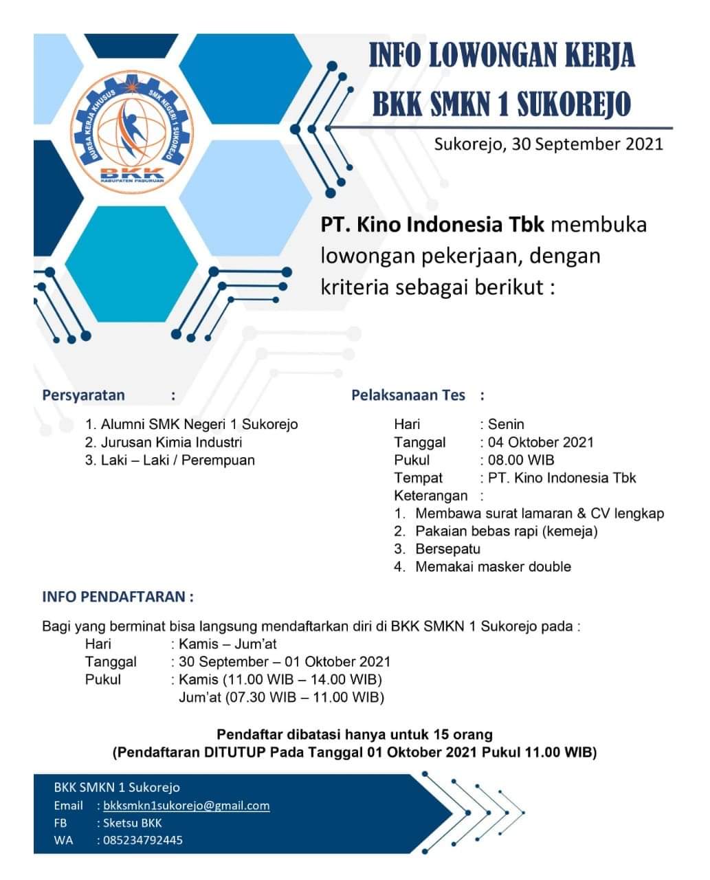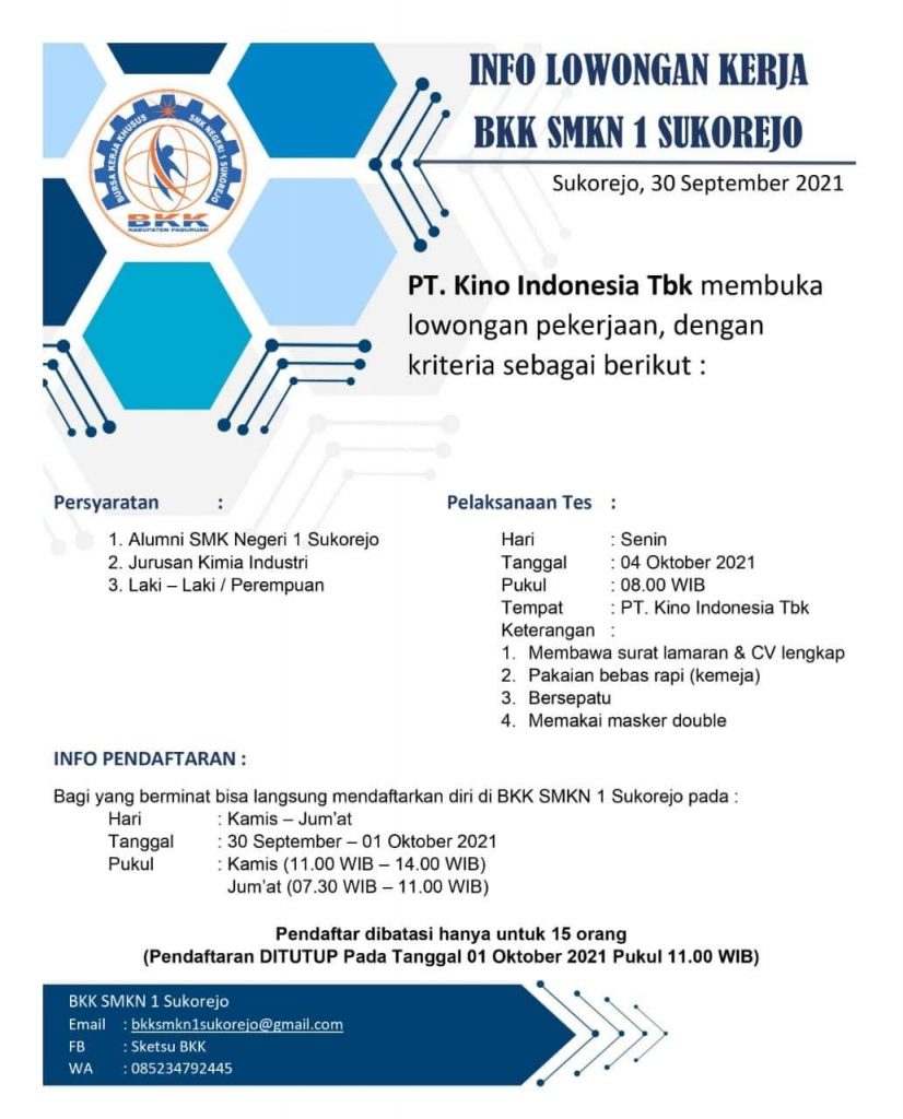 Lowongan Kerja PT. Kino Indonesia Tbk Kegiatan BKK Kegiatan Sekolah 20 September 20217 November 2021 adminLeave a Comment on Lowongan Kerja PT. Kino Indonesia Tbk