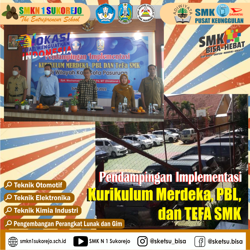 Pendampingan Implementasi Kurikulum Merdeka, PBL, dan TEFA SMK dilaksanakan di SMKN 1 Sukorejo dengan didampingi oleh perwakilan Cabang Dinas Wilayah Pasuruan dan Direktorat SMK yaitu Bapak Mochamad Widiyanto, S.Pd., M.T. Pelaksanaan tersebut diikuti oleh beberapa Kepala Sekolah SMK Negeri maupun Swasta di Wilayah Kabupaten dan Kota Pasuruan.