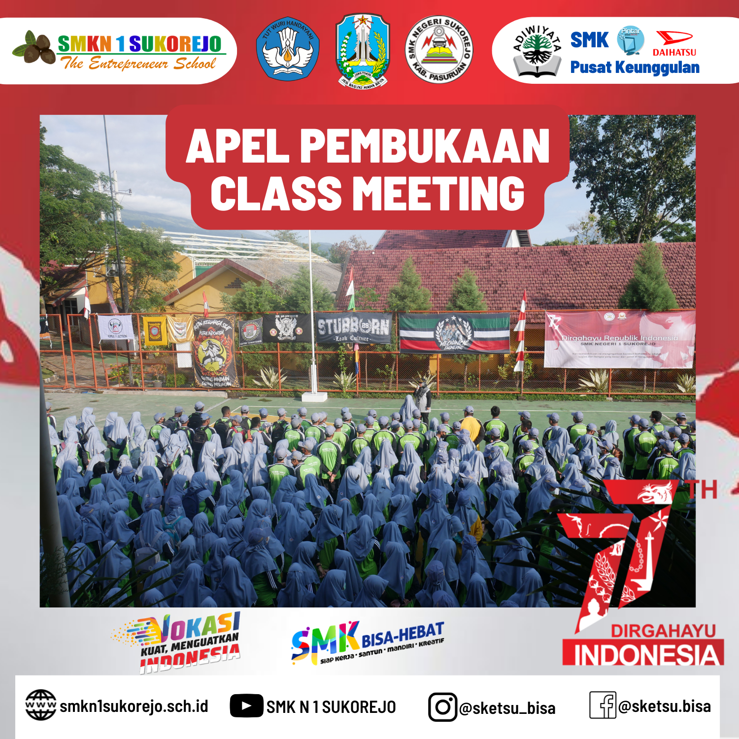 Pada hari Senin, 15 Agustus 2022 diadakan apel pembukaan kegiatan Class Meeting untuk perayaan kemerdekaan RI. Apel diikuti oleh seluruh peserta didik, guru serta staff tata usaha.