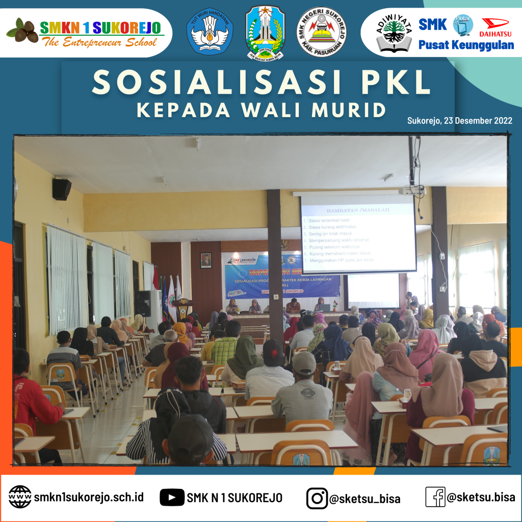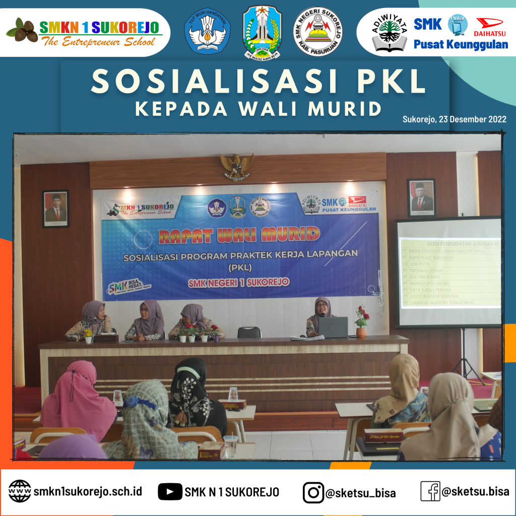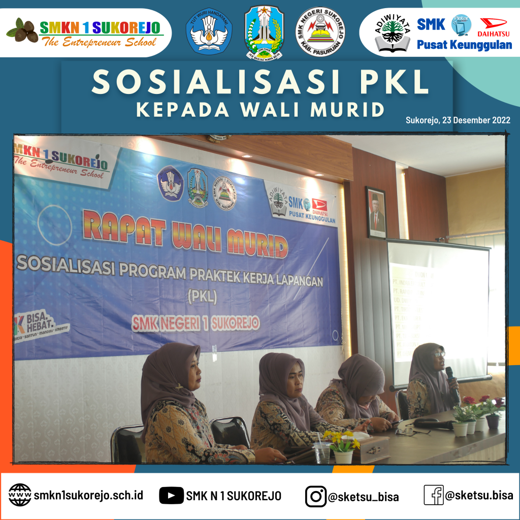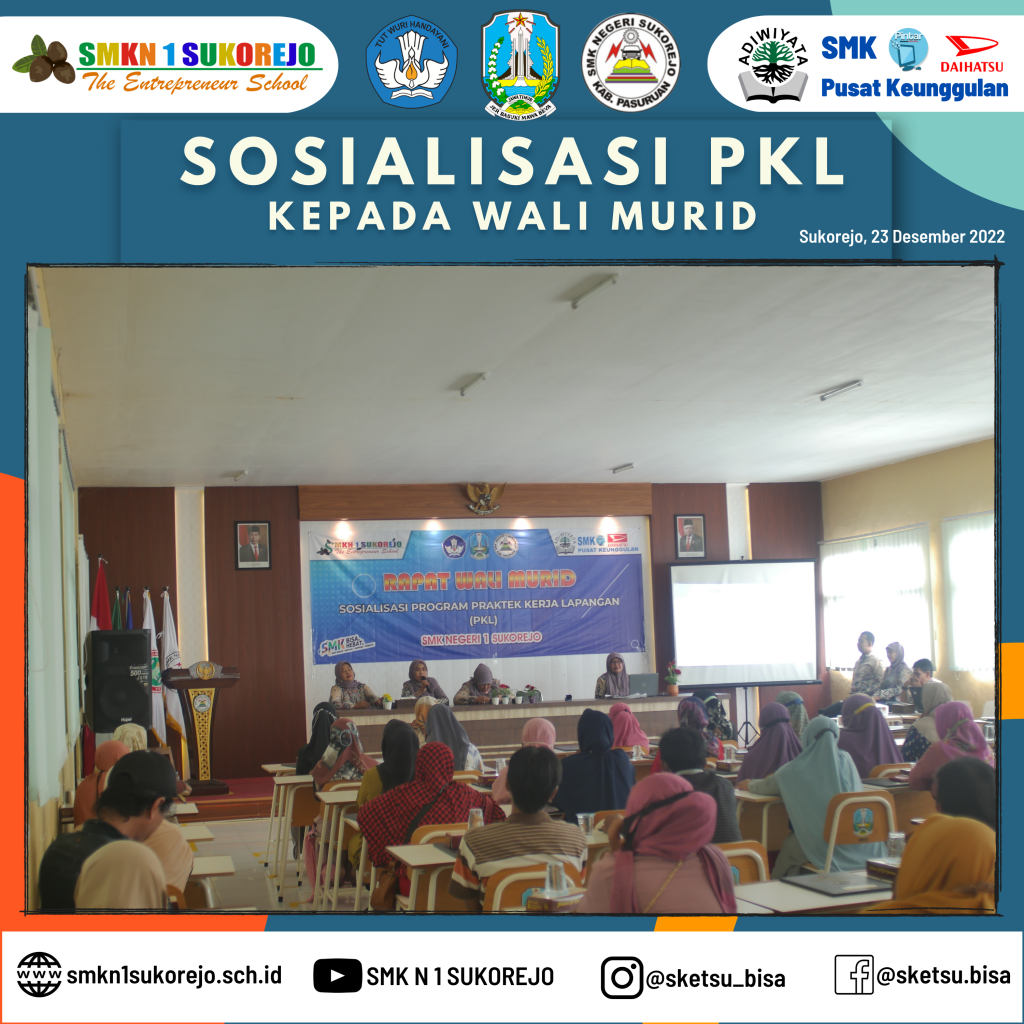 Sukorejo, 23 Desember 2022 telah dilakukan pengambilan Raport semester gasal tahun pelajaran 2021/2022 oleh wali murid. Dalam kesempatan ini pula wali murid dari kelas XI TKR 2, 3 XI TEI 1, XI TAV, XI RPL 2 dan XI KI 1 dikumpulkan dalam rangka Sosialisasi Program Praktik Kerja Lapangan (PKL) Sesuai Agenda yang telah ditetapkan oleh Pokja PKL, PKL akan dilaksanakan selama 6 bulan mulai Januari 2023 yang akan datang.