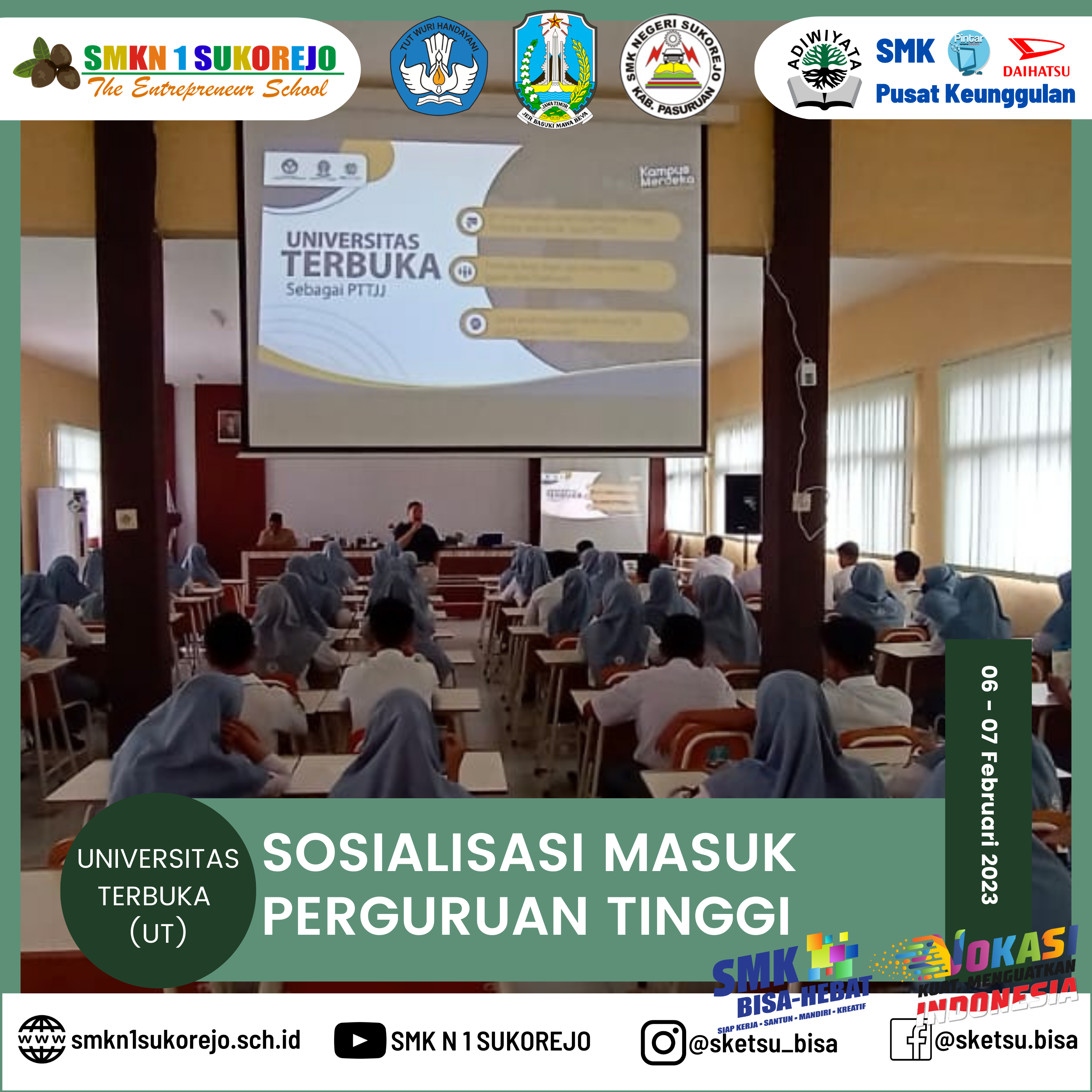 Universitas Terbuka mengadakan sosialisasi selama 2 hari mulai tanggal 06 – 07 Februari 2023 kepada peserta didik kelas XII. Sosialisasi bertujuan untuk membuka wawasan tentang Perguruan Tinggi agar nantinya lulusan SMK Negeri 1 Sukorejo berminat dan melanjutkan studi ke Perguruan Tinggi dengan kompetensi sesuai bakat dan minatnya.