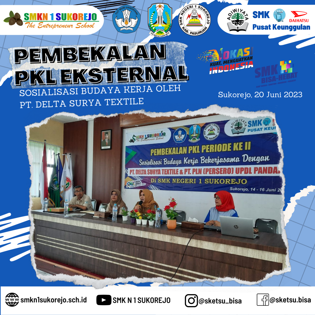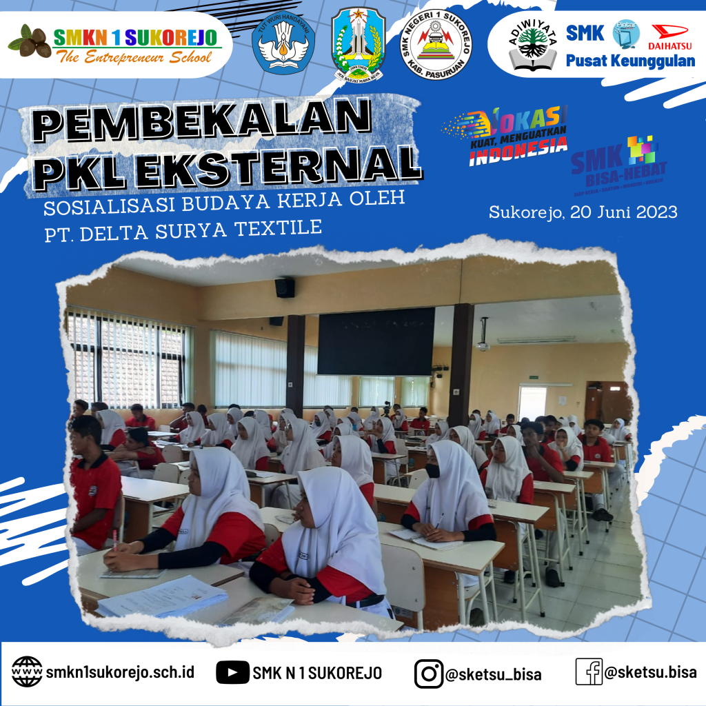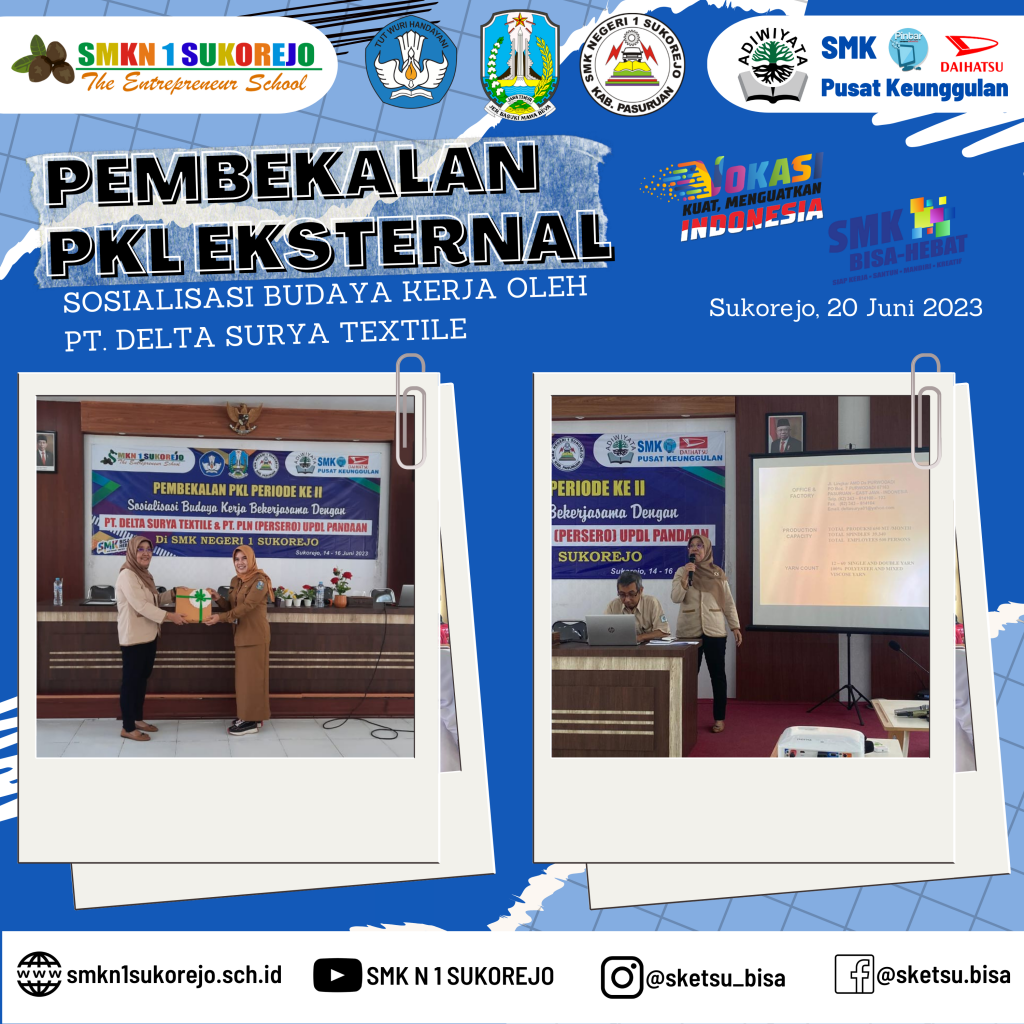 Sukorejo, 20 Juni 2023 PT Delta Surya Textile hadir di SMK Negeri 1 Sukorejo dalam rangka menjadi pemateri kegiatan Pembekalan PKL Gelombang 2 Tahun Pelajaran 2022/2023.