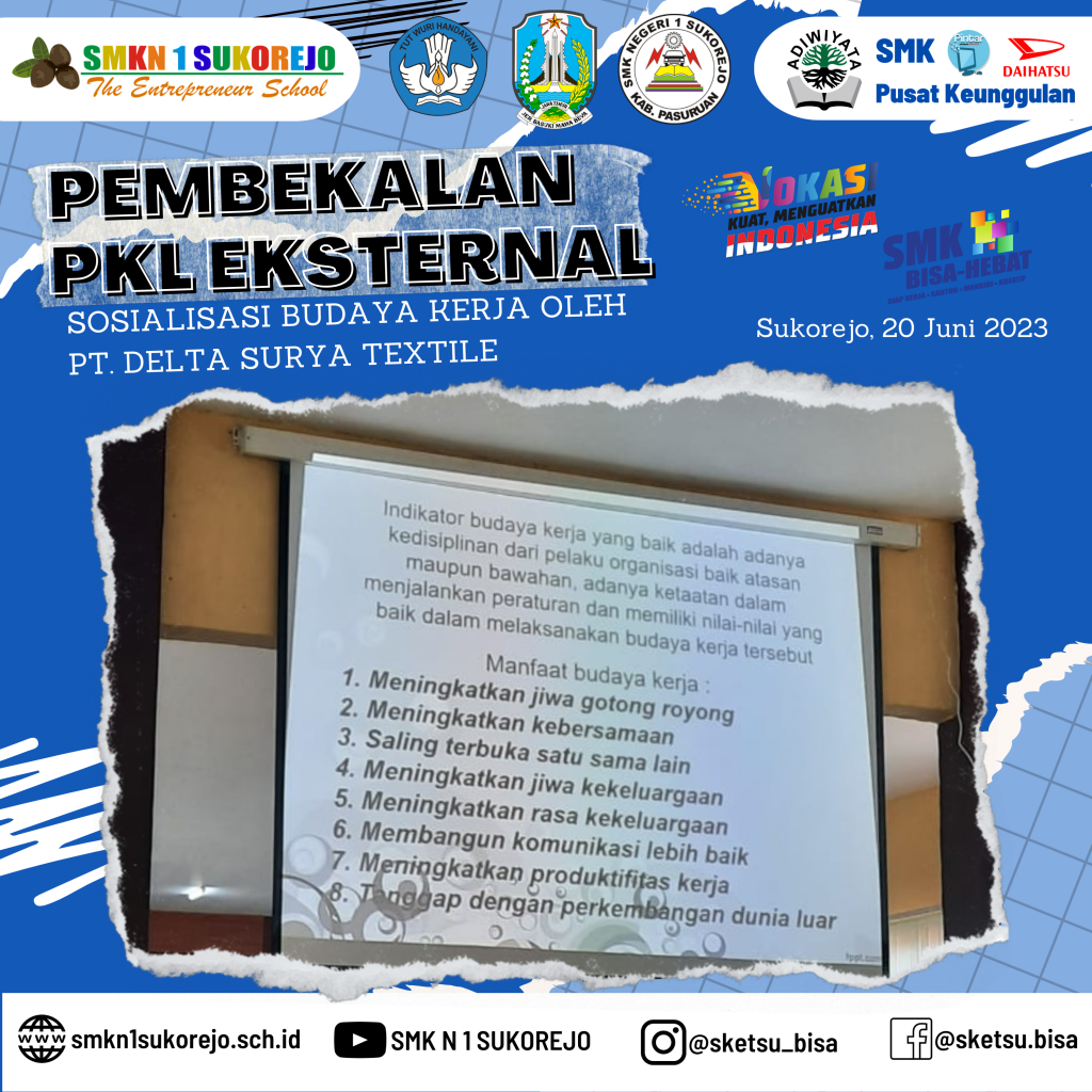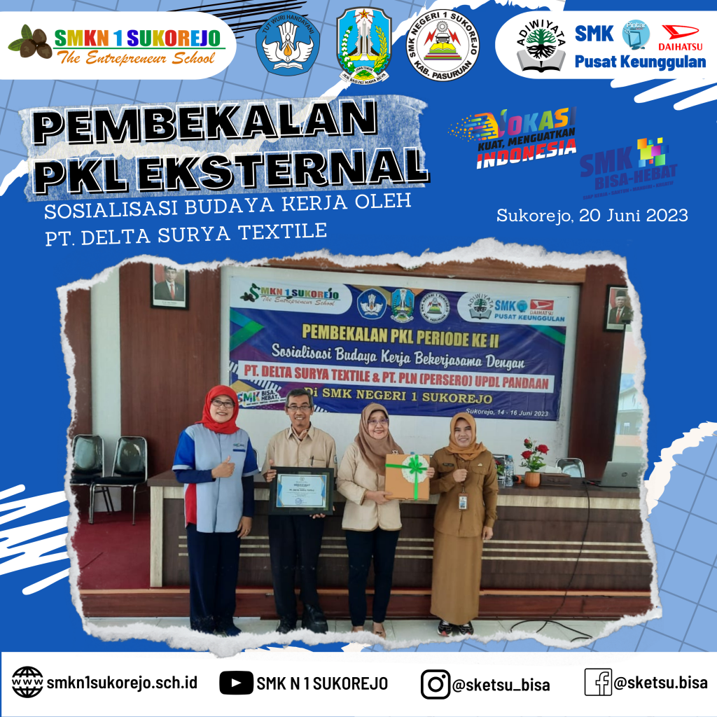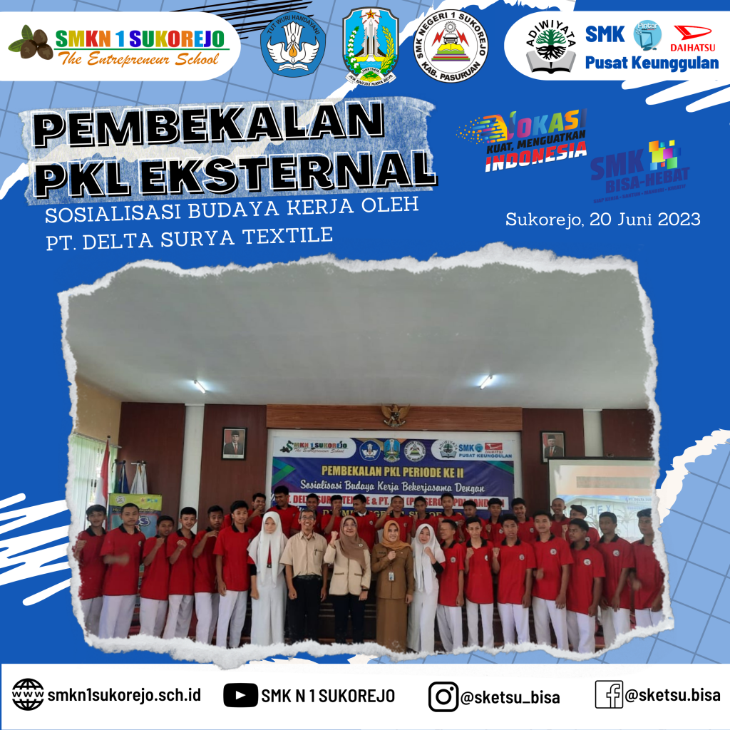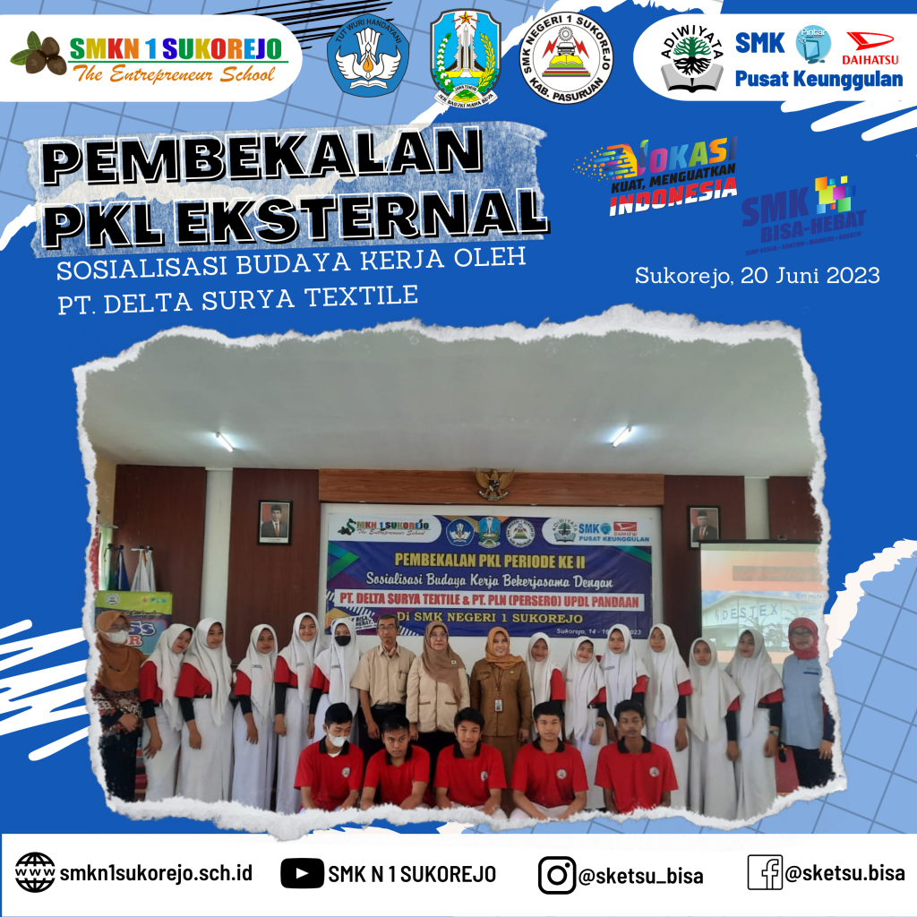 Sukorejo, 20 Juni 2023 PT Delta Surya Textile hadir di SMK Negeri 1 Sukorejo dalam rangka menjadi pemateri kegiatan Pembekalan PKL Gelombang 2 Tahun Pelajaran 2022/2023.
