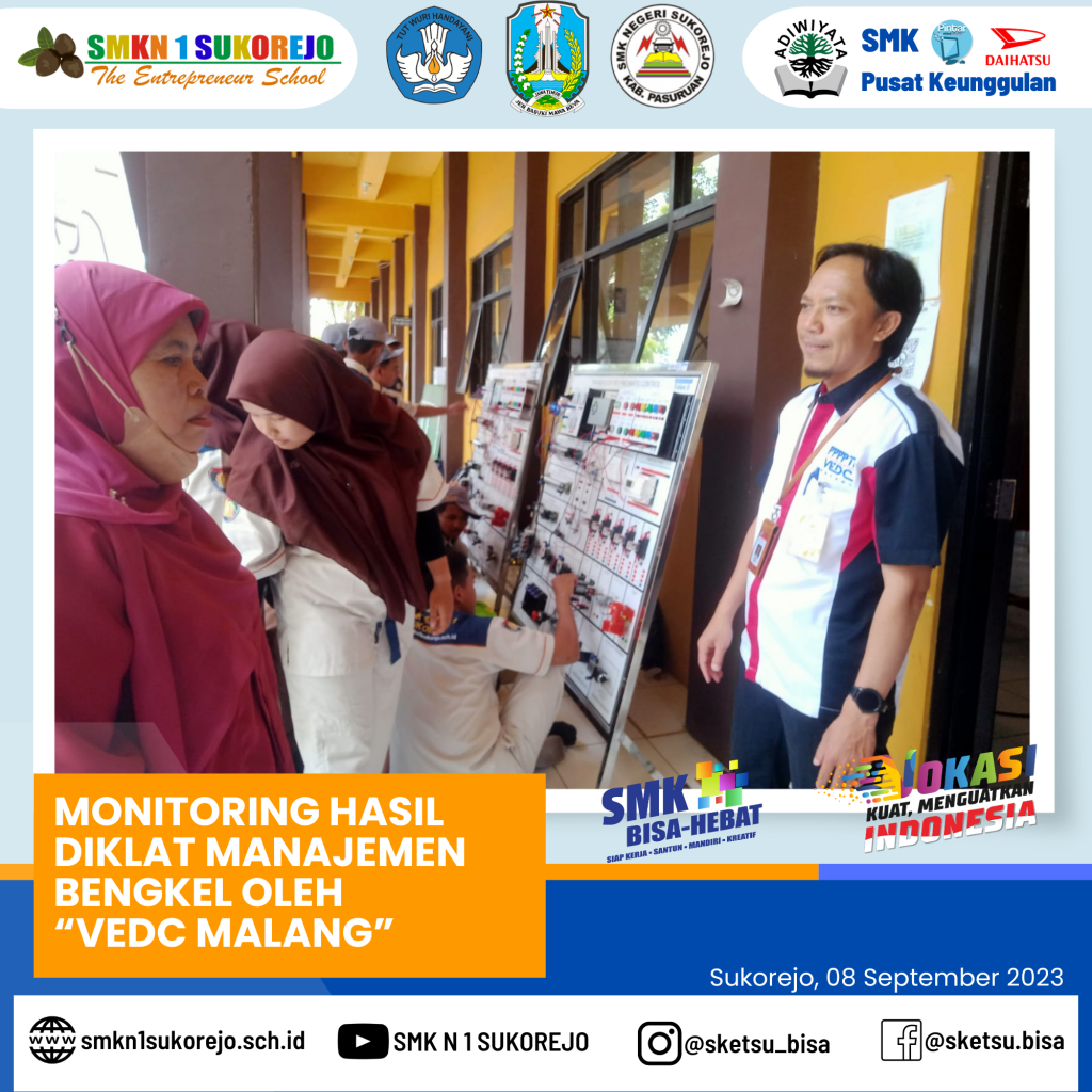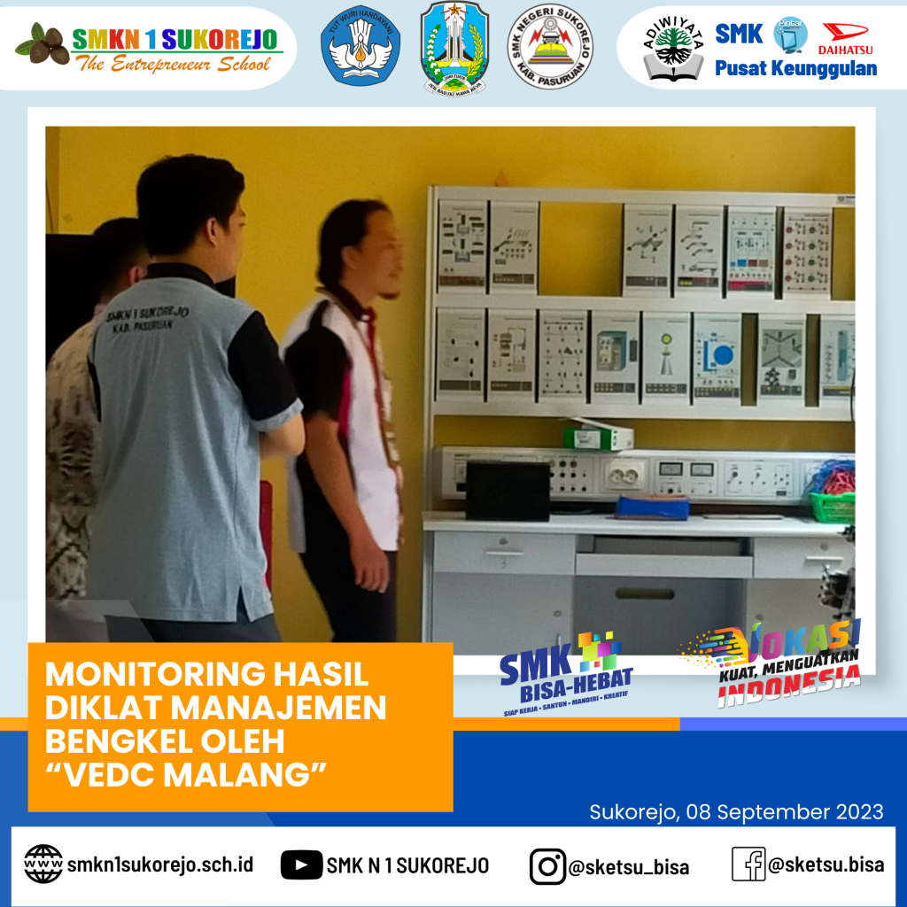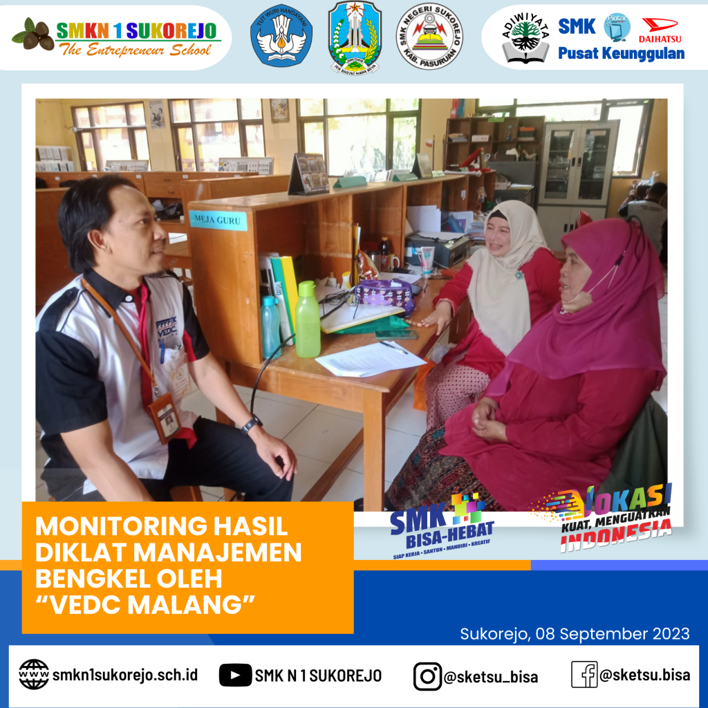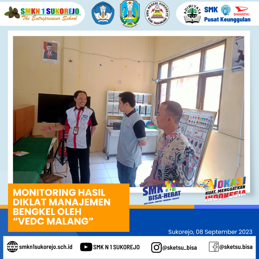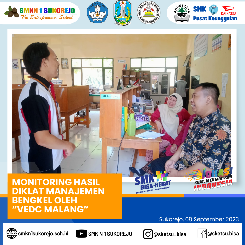 Pada hari ini, Jum’at, 08 September 2023 Vocational Education Development Center (VEDC) Malang hadir di SMK Negeri 1 Sukorejo dalam rangka monitoring hasil diklat Manajemen Bengkel / Laboratorium yang telah diselenggarakan Maret lalu.