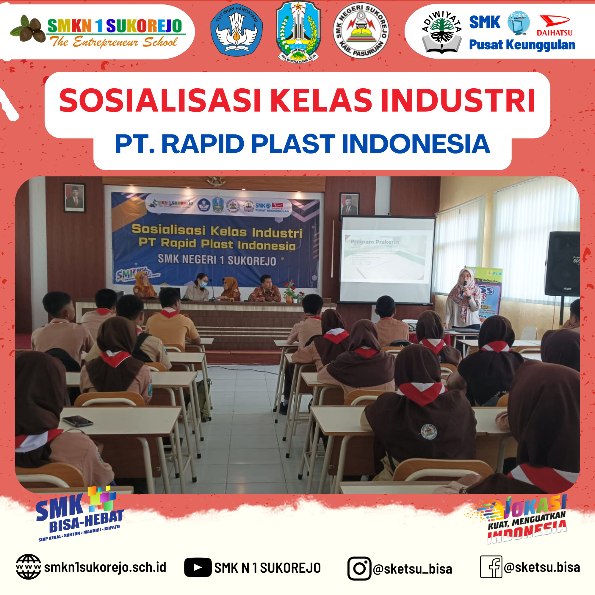 Sukorejo, 15 September 2023 PT. Rapid Plast Indonesia berkesempatan hadir ke SMK Negeri 1 Sukorejo dalam rangka Sosialisasi Kelas Industri. Kelas Industri merupakan program pengadaan kelas khusus dalam lingkungan sekolah. Kelas ini dikelola bersama sama antara sekolah dengan industri. Melalui kelas industri diharapkan kompetensi yang dimiliki peserta didik setelah lulus memang sudah sesuai dengan kriteria yang dibutuhkan di dunia kerja.
