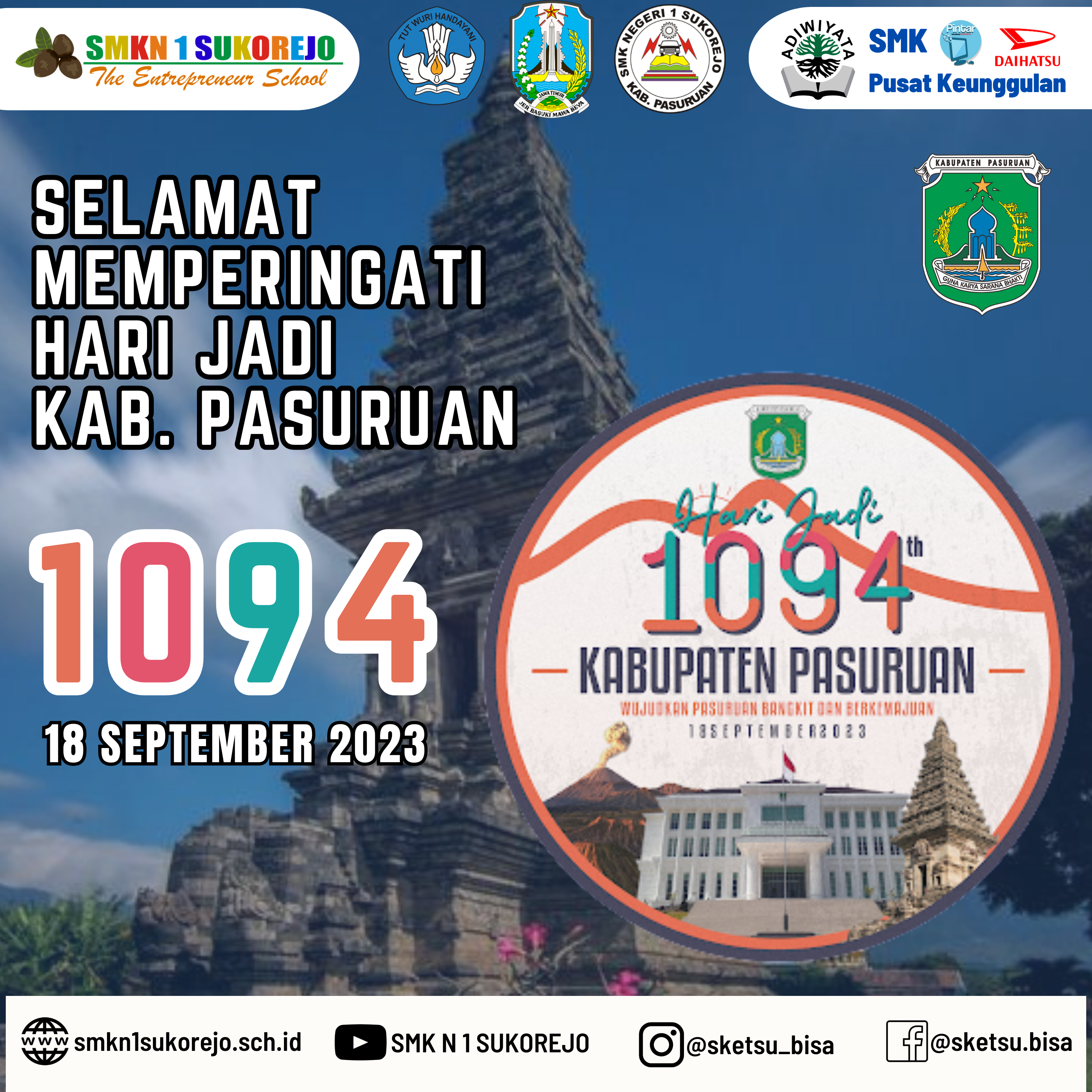 Sukorejo, 18 September 2023 bertepatan dengan peringatan hari jadi Kabupaten Pasuruan yang ke 1094 dilaksanakan upacara bendera di lapangan SMK Negeri 1 Sukorejo.