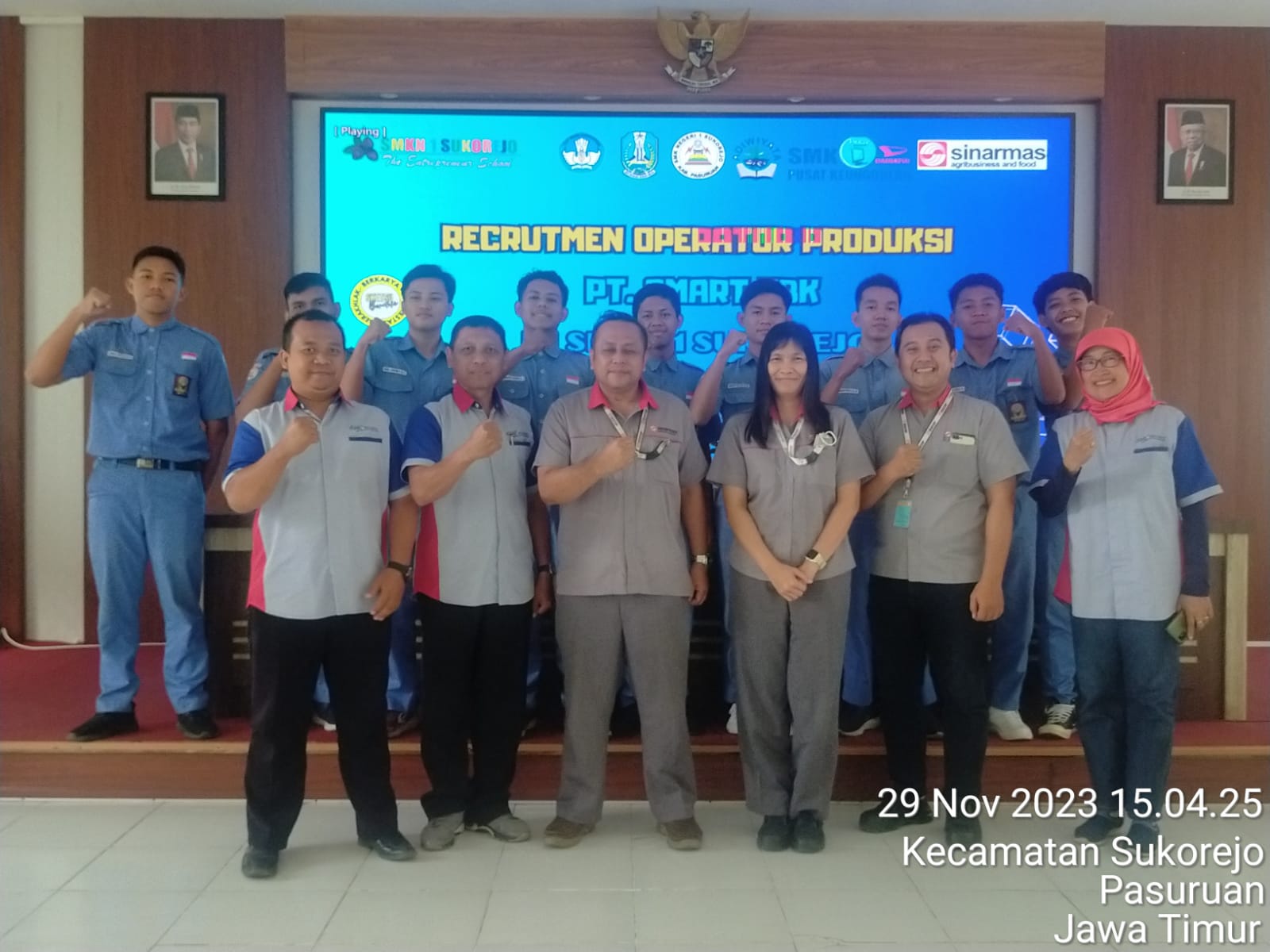 Sukorejo, 29 November 2023 – Pada hari Rabu, 29 November 2023, SMKN 1 Sukorejo telah dilaksanakan kegiatan rekrutmen karyawan oleh PT. Smart Tbk (Sinar Mas Grup) di aula sekolah. Kegiatan ini berfokus pada penerimaan operator produksi, dengan penekanan khusus pada lulusan jurusan Teknik Kimia Industri (TKI).