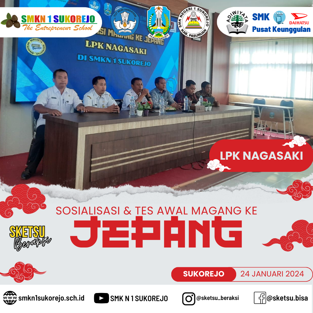 Sukorejo, 24 Januari 2024 – LPK Nagasaki kembali hadir di SMK Negeri 1 Sukorejo untuk melaksanakan sosialisasi sekaligus rekrutment awal kepada calon peserta pemagangan ke Jepang. Kegiatan ini berlangsung di Aula SMKN 1 Sukorejo dan diikuti oleh peserta didik kelas 12, Alumni dan Orang tua.